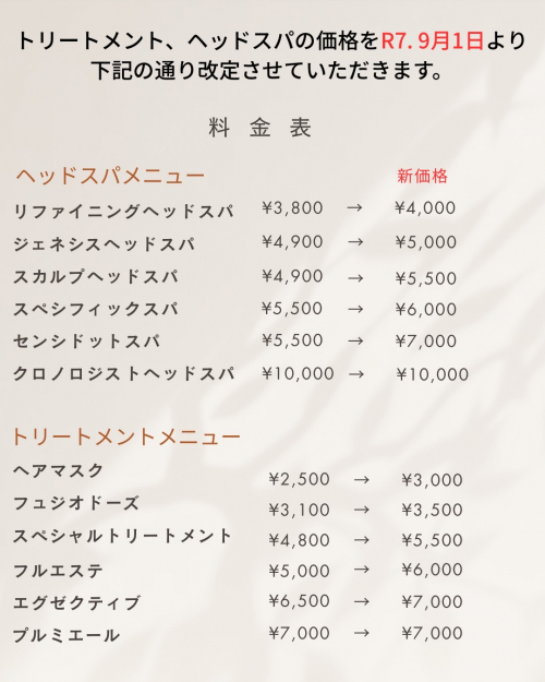 度々の材料費・輸送費の高騰により、トリートメント・ヘッドスパの金額を9月1日より改定させていただきます。ご不便をお掛けしますがよろしくお願いします。